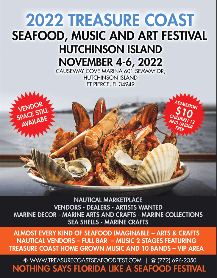 Visit the 2022 Treasure Coast Seafood Music and Art Festival Hutchinson Island Nov 4-6, 2022 Ft Pierce website for more information, vendor information, special hotel rates and specific driving directions. https://treasurecoastseafoodfest.com.